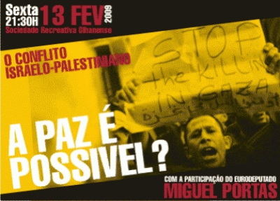 Em Olhão, na Sexta-feira, dia 13, pelas 21.30 horas, Miguel Portas animará um colóquio/debate em torno da problemática do actual conflito na faixa de Gaza, sob o título “Conflito israelo-palestiniano: A paz é possível?”. O colóquio realizar-se-á na Sociedade Recreativa Olhanense, no âmbito de uma exposição sobre a Guerra em Gaza, organizada e produzida pela Associação Cultura Árabe.